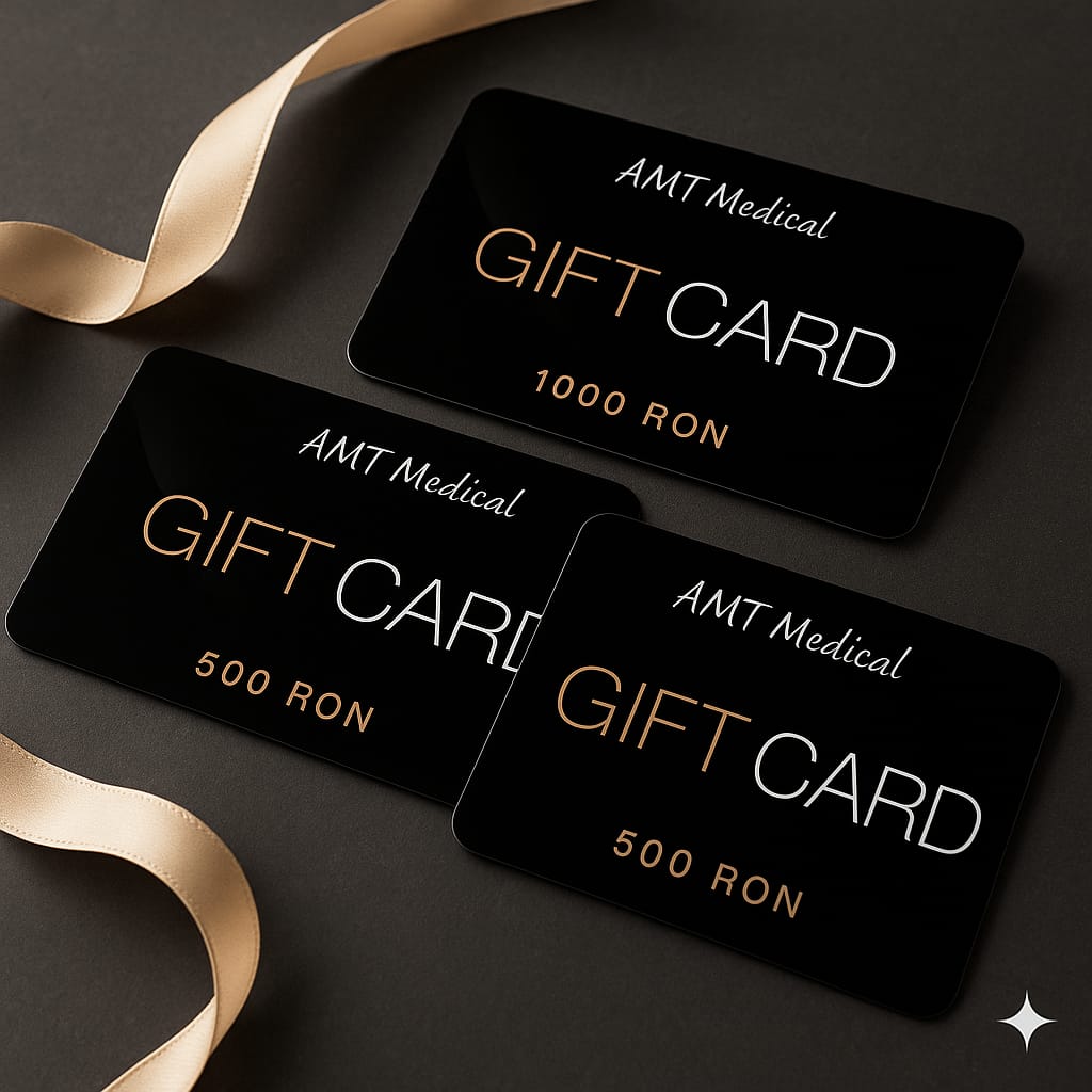 Oferă sănătate, echilibru și frumusețe celor dragi cu un voucher cadou AMT Medical, disponibil în valori de 300 RON, 500 RON și 1000 RON.